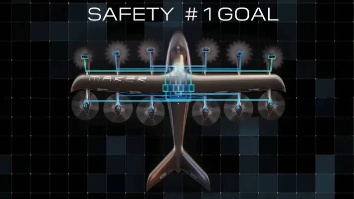 El avión eléctrico, llamado Maker, destaca por tener un total de 12 rotores los que se reparten en cada una de sus dos alas, las que sobresalen de un fuselaje ovalado.