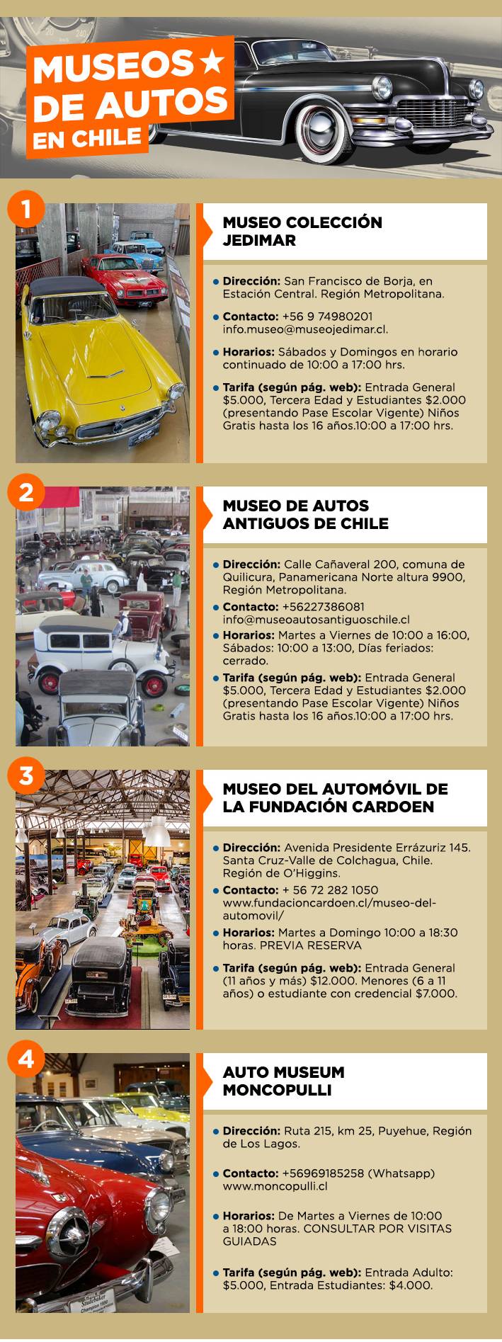 Si está en Santiago el Museo Colección Jedimar es un lugar más que recomendado para visitar gracias a una gran exposición de ejemplares clásicos de marcas tales como Porsche, Ferrari, Bugatti, Aston Martin, Bentley, Jaguar y Studebaker, entre otros.