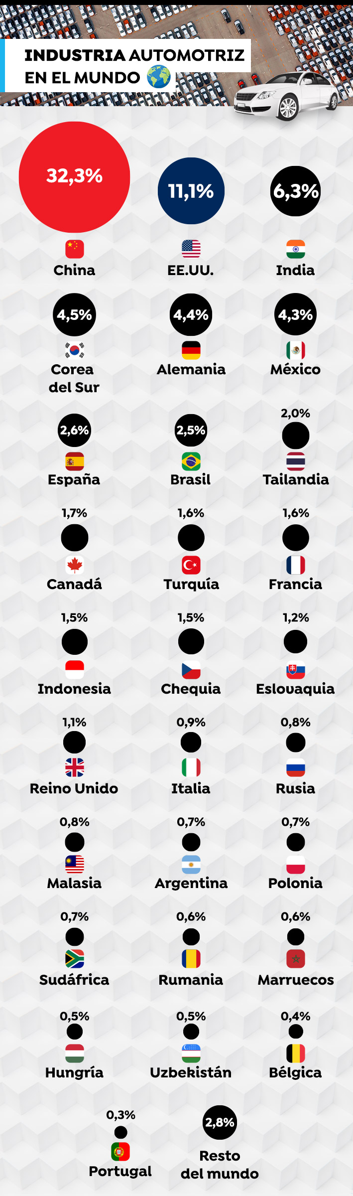 Según las últimas cifras consolidadas en un estudio de la International Organization of Motor Vehicle Manufacturers (OICA), en 2023 el gigante chino dominó este sector con cifras récord: más de 30 millones de vehículos producidos en ese año, lo que equivale a casi un tercio de los automóviles fabricados en todo el mundo.