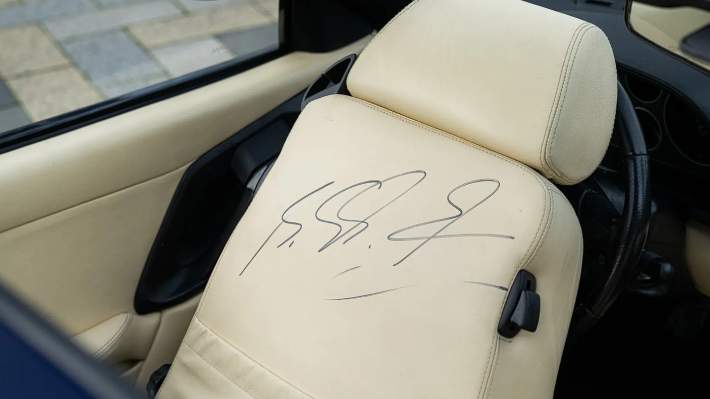 El periodista, conocedor de la procedencia del vehículo, logró que el siete veces campeón de la Fórmula 1 lo firmara en la parte posterior del respaldo del conductor en 2012, un detalle que ahora incrementa aún más el valor del auto.