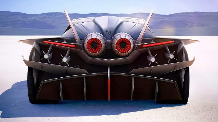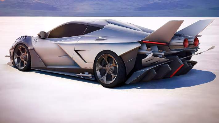 Mxtrem también diseñó unas distintivas rejillas de ventilación para los paneles laterales delanteros y transformó los cuartos traseros del deportivo estadounidense. Hay nuevas entradas de aire, alas inspiradas en los aviones y dos aletas verticales como las de un F/A-18. Incluso tiene una imitación de propulsores de avión en la parte trasera, además de más misiles falsos y un extraño difusor.
