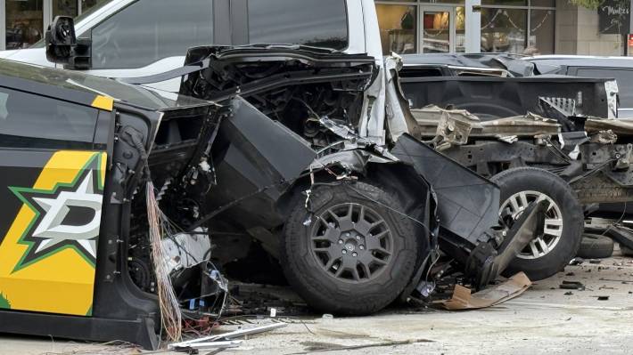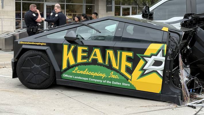 El choque fue tan violento que el Cybertruck, que llevaba gráficas promocionales de Keane Landscaping, terminó destrozado: su caja, chasis, suspensión trasera y ruedas quedaron esparcidos por la calle, mientras que la parte delantera permaneció relativamente intacta.