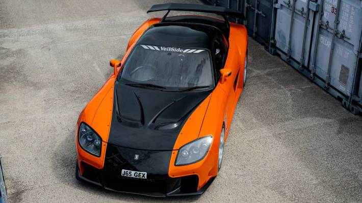 Este modelo destaca por su exclusivo kit de carrocería "Fortune" de VeilSide, que reemplaza casi todos los paneles originales, salvo el techo y el portón trasero.