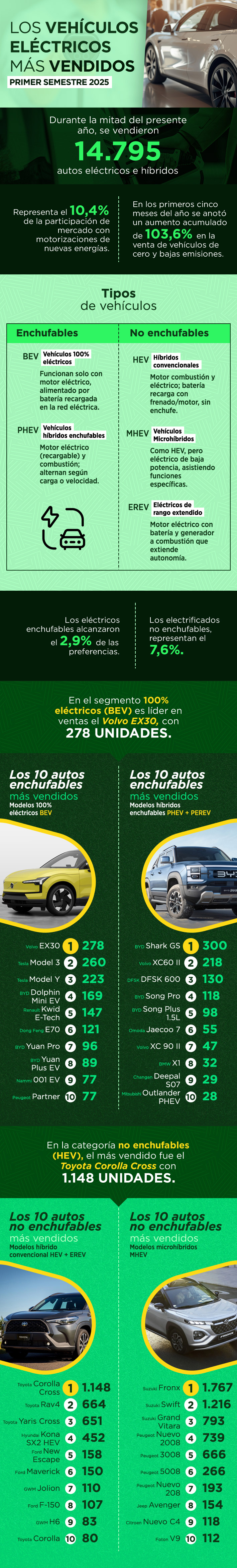 Entre enero y junio se vendieron 14.795 unidades de nuevas energías, lo que se traduce en un alza del 103,6% en relación a igual periodo del año pasado. Los modelos electrificados no enchufables lideran en volumen de colocaciones, mientras crece la oferta de marcas y modelos eléctricos en Chile.