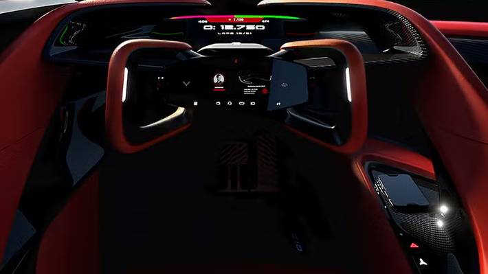 El interior es igual de radical con dos asientos de carreras con arneses de seguridad y una cabina envolvente de color rojo, dominada por fibra de carbono y pantallas digitales. El volante, de estilo aeronáutico, refuerza el carácter experimental del prototipo.