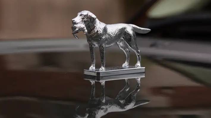Destaca el vehículo por su carrocería en Verde Tonga, interior en cuero Oxford color arena y detalles únicos como el perro de la guardia real en el capó, asas de acceso, estribos laterales, compartimento adaptado para sus canes, molduras de nogal y cristales transparentes.