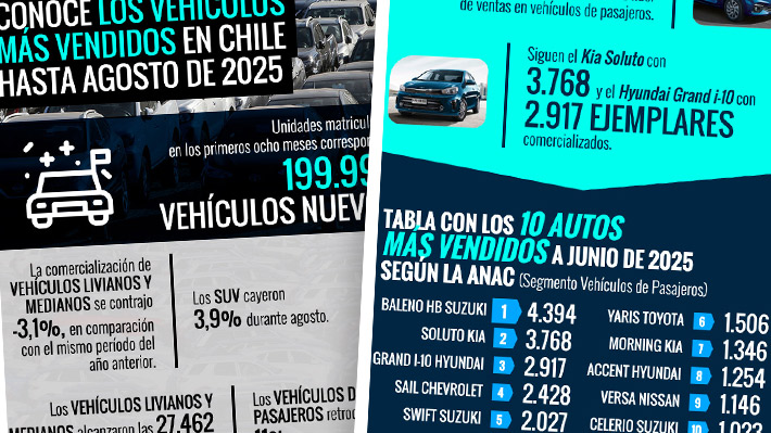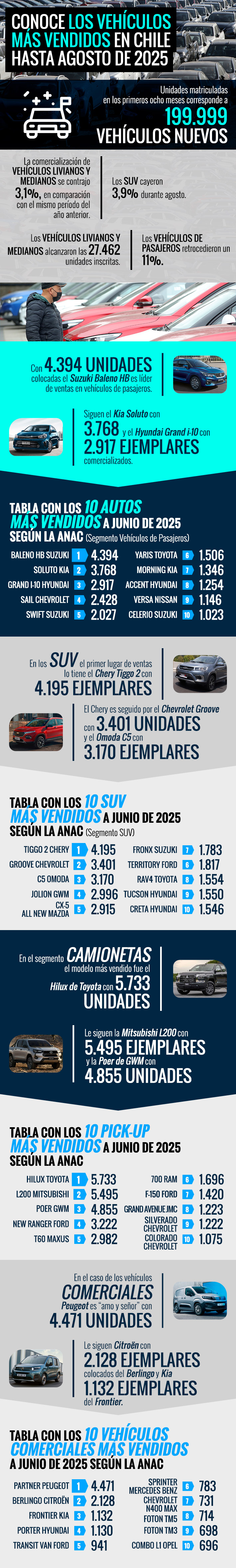 Revisa una infografía con las marcas y modelos más vendidos en los principales segmentos y los resultados anotados hasta el octavo mes del año.
