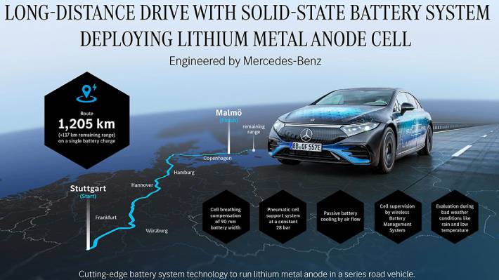 Mercedes-Benz dio un paso clave en el desarrollo de las baterías de estado sólido al demostrar que esta tecnología puede ofrecer una autonomía sin precedentes, algo que comprobó con un EQS modificado que logró unir las ciudades de Stuttgart (Alemania) y Malmö (Suecia) cubriendo unos 1.200 kilómetros con una sola carga.