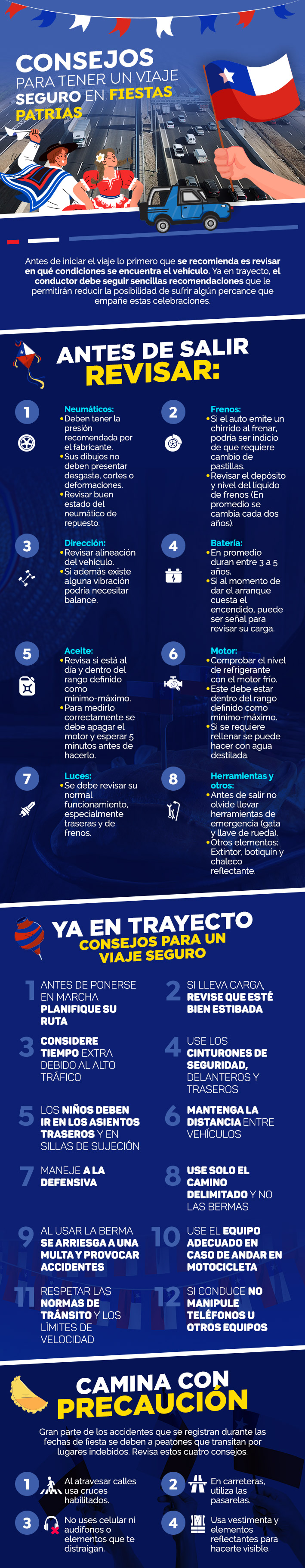 Quedan pocos días para el inicio de Fiestas Patrias y muchas familias se preparan para tomar su vehículo y pasar los días de celebración fuera de la ciudad. Para evitar problemas, antes de partir se recomienda revisar el buen funcionamiento del automóvil y seguir algunos simples consejos para hacer del viaje un trayecto seguro.