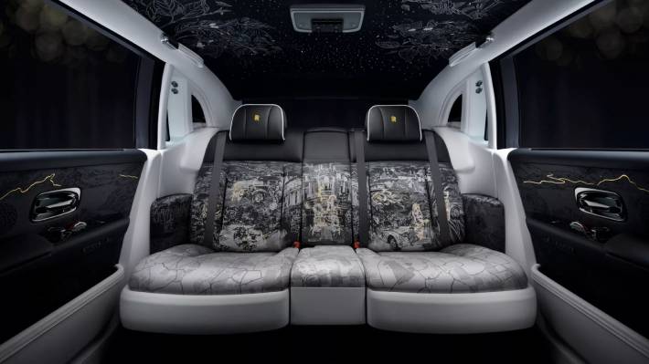 En un guiño al pasado, los asientos traseros están tapizados en tela, como ocurría en los modelos originales destinados a pasajeros, mientras que los delanteros, reservados para los chóferes, incorporan ilustraciones grabadas con láser inspiradas en el Phantom I de 1923.