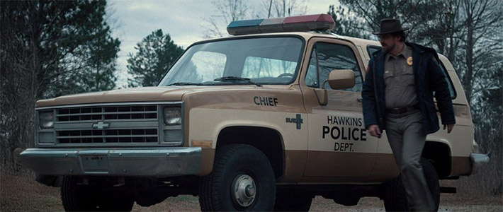En la serie Stranger Things el jefe Jim Hopper es el jefe de policía de Hawkins, Indiana, y la figura paternal de los personajes. Inicialmente se presenta como un hombre hosco, cínico y con problemas de alcohol, que vive atormentado por la trágica pérdida de su hija biológica. Conduce una Chevrolet Blazer K5 de 1980. Este modelo es definido como un clásico americano de dos puertas, grande y cuadrado, famoso por su diseño robusto y musculoso. Fue lanzado para competir con la Ford Explorer. Tenía motor naftero 2.5 litros de 93 HP.