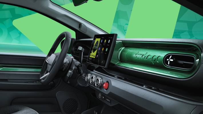 El diseño interior también busca destacar por su carácter lúdico y personalizable: incluye detalles de color, un selector de marchas con forma de lápiz labial y un asistente virtual llamado Reno, capaz de responder preguntas o brindar información sobre la carga.