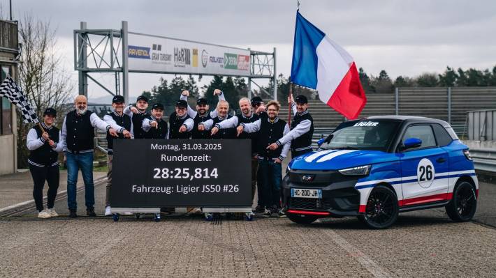 Además del modelo diésel, Ligier también presentó dos versiones eléctricas del JS50 durante la prueba. La variante eléctrica L6e, igualmente limitada a 45 km/h, registró un tiempo de 27 minutos y 55,58 segundos, mientras que la versión L7e, más potente y con una velocidad máxima de 75 km/h, completó la vuelta en 19 minutos y 53,36 segundos.