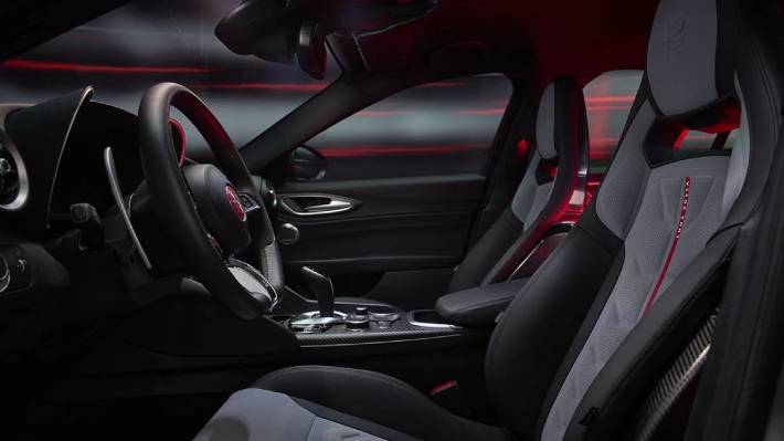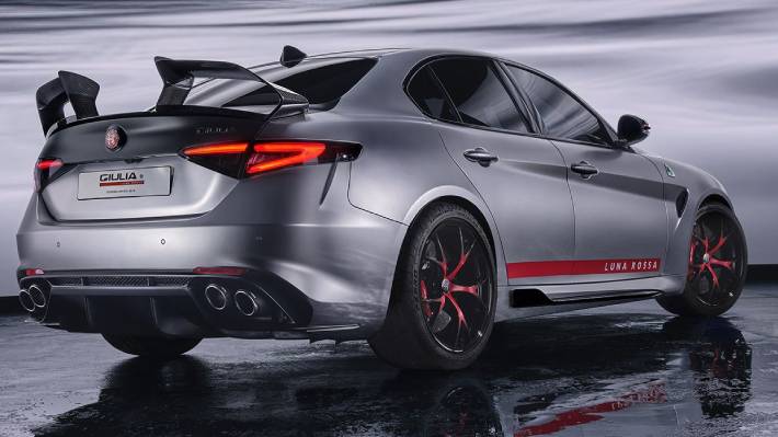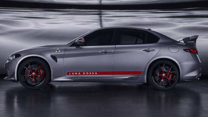 Desarrollado en colaboración con el equipo de vela Luna Rossa de la Copa América, este Giulia especial se distingue por una aerodinámica profundamente revisada. Incorpora componentes de fibra de carbono como canards delanteros, nuevos perfiles en los bajos, faldones laterales específicos y un gran alerón trasero inspirado en los hidroplanos del yate de competición. El resultado es una carga aerodinámica cercana a los 140 kilos a 300 km/h, una cifra muy superior a la del Quadrifoglio convencional.