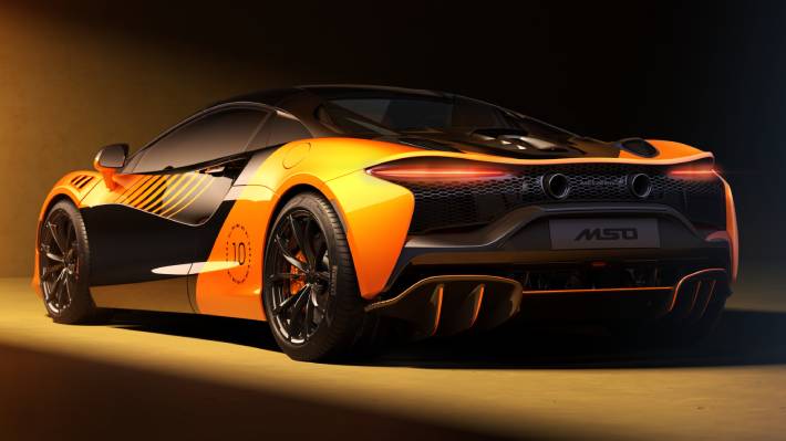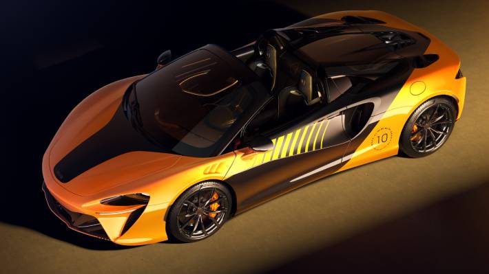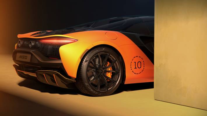 El modelo adopta una decoración pintada a mano inspirada en el auto de competición. Combina el color Myan Orange con negro Onyx e incorpora un motivo con el número 10 acompañado de diez estrellas y las siluetas de todos los McLaren de Fórmula 1 campeones desde 1974.