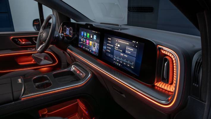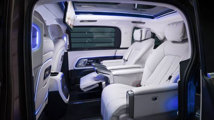 El equipamiento incluye además un sistema de sonido envolvente 3D Burmester con 22 altavoces y un techo panorámico fijo Sky View con iluminación ambiental. El habitáculo suma mesas plegables, consolas con cargadores inalámbricos para smartphones y compartimentos con funciones de calefacción y refrigeración.