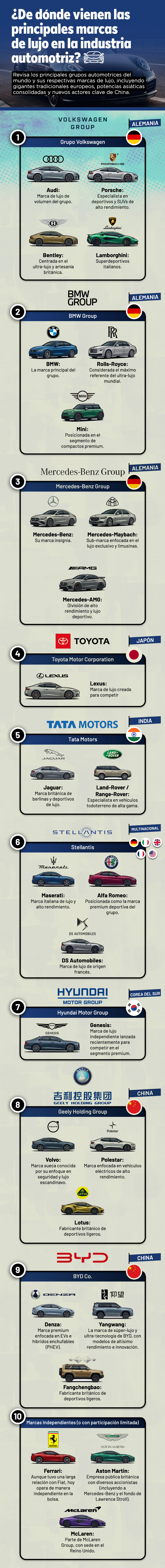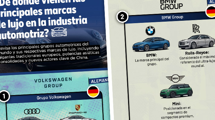 Hablar de autos de lujo no es solo mencionar nombres icónicos como Ferrari o Rolls-Royce, sino también entender la compleja red de conglomerados que las respaldan. Hoy, gigantes como Volkswagen Group, BMW Group y Toyota Motor Corporation están detrás de las marcas más exclusivas de la industria. Revisa una infografía con el detalle de esto.