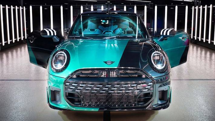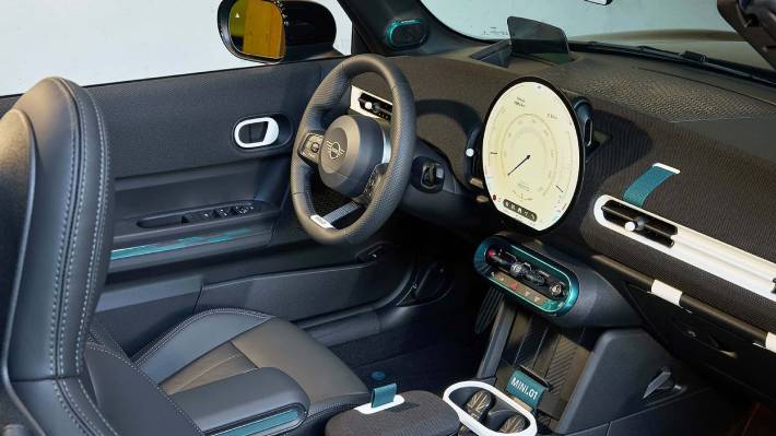 En el interior, la personalización continúa con el mismo tono verde presente en distintos elementos, como los asientos, la consola central y el tablero. Estos se combinan con acabados en blanco mate para generar contraste, junto a detalles exclusivos como logotipos “MINI.01” distribuidos en distintos puntos del habitáculo.