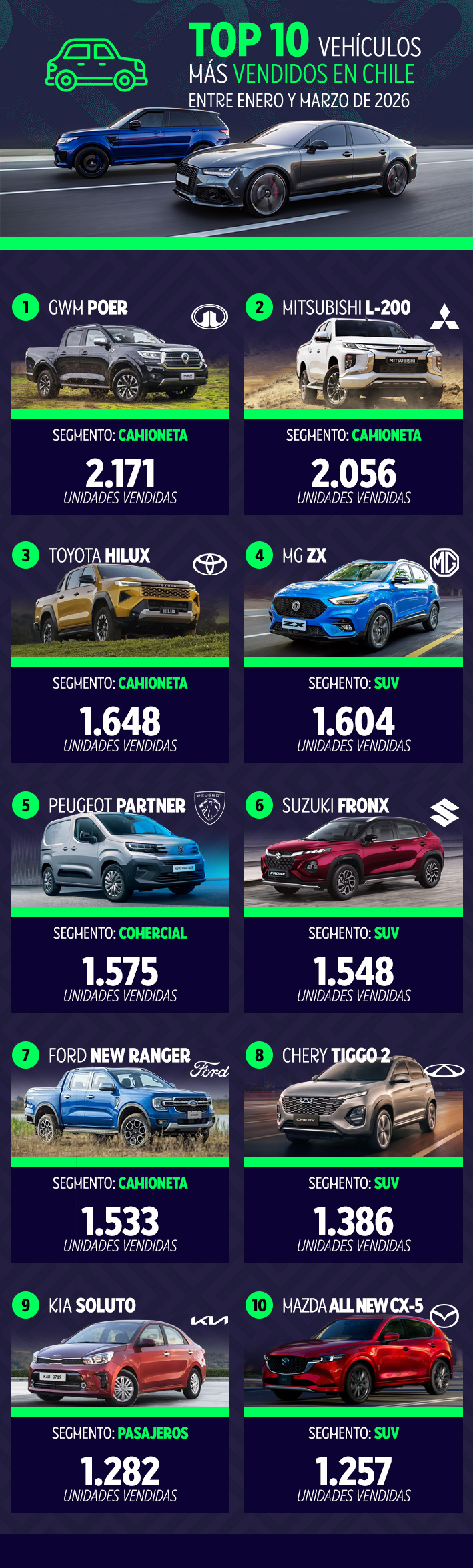 Infografía: Estos son los 10 vehículos más vendidos en Chile en el primer trimestre