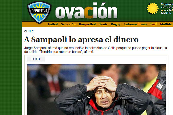 Ovación tituló que "A Sampaoli lo apresa el dinero". Agregan que "Jorge Sampaoli afirmó que no renunció a la selección de Chile porque no puede pagar la cláusula de salida. 'Tendría que robar un banco', afirmó".