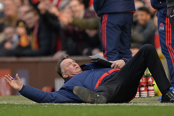 Van Gaal fue a protestarle al asistente y no encontró mejor forma que tirarse sorpresivamente al piso recreando la acción que segundos antes había cobrado el juez.