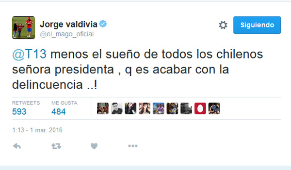 Ante esto el jugador formado en Colo Colo replicó a través de la red social con una frase directa. "Menos el sueño de todos los chilenos señora Presidenta , que es acabar con la delincuencia", fue la respuesta del futbolista.