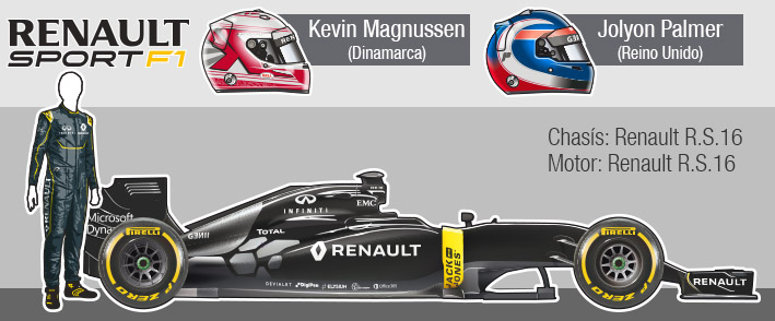 El equipo francés volverá a la Fórmula 1 este año, tras ausentarse desde que en 2011 compitiera junto al fabricante automovilístico inglés Lotus. Alguna vez contó con el afamado piloto español Fernando Alonso, quien fue bicampeón mientras representaba a Renault en 2005 y 2006. Actualmente, los conductores de la marca gala son el danés Kevin Magnussen y el británico Jolyon Palmer.