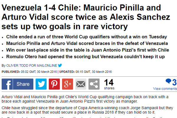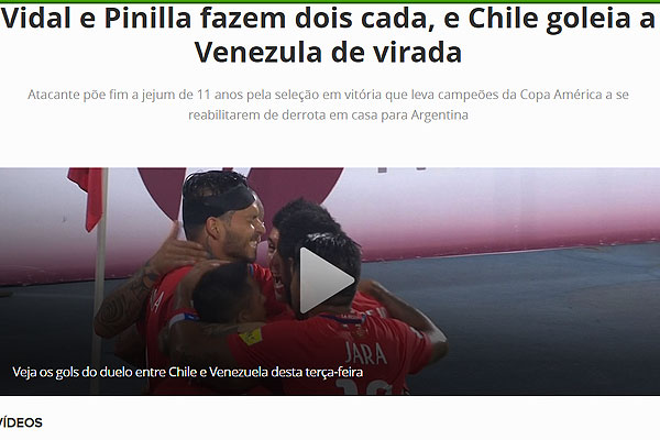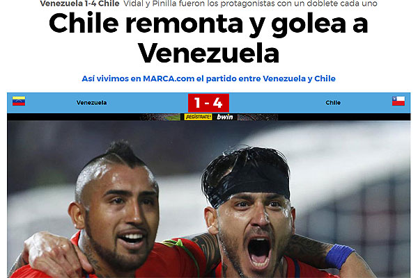 "Con el regreso de Arturo Vidal tras la sanción y, con un Mauricio Pinilla entonado, los de Juan Antonio Pizzi sobrepasaron a una Venezuela que a pesar de empezar ganando con un golazo de Rómulo Otero, hizo del partido un querer y no poder".