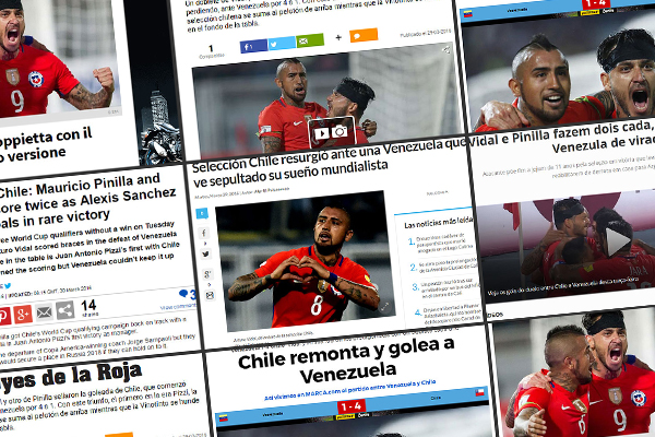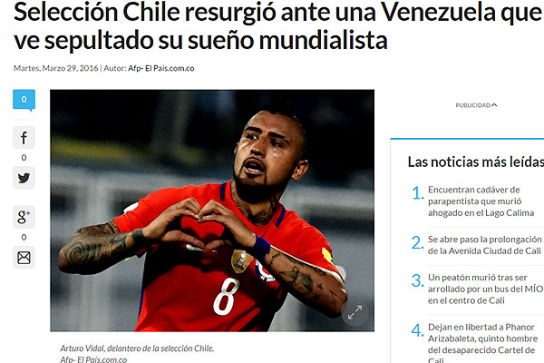 "Selección de Chile resurgió ante una Venezuela que ve sepultado su sueño mundialista. Chile resurgió en la clasificatoria sudamericana al Mundial Rusia 2018 al golear 4-1 a Venezuela, que prácticamente ve sepultado su sueño de jugar por primera vez la Copa del Mundo, en partido disputado la noche del martes en la ciudad de Barinas".