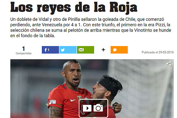 "Los reyes de la Roja. Un doblete de Vidal y otro de Pinilla sellaron la goleada de Chile, que comenzó perdiendo, ante Venezuela por 4 a 1. Con este triunfo, el primero en la era Pizzi, la selección chilena se suma al pelotón de arriba mientras que la Vinotinto se hunde en el fondo de la tabla".