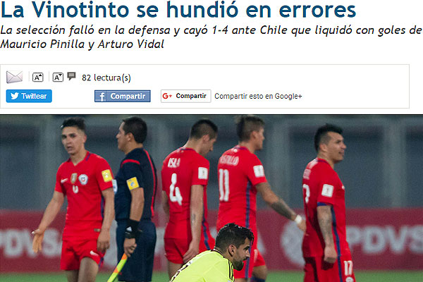 "La Vinotinto se hundió en errores. Venezuela volvió a sucumbir ante la precisión y la velocidad de Chile, que sacó ventaja de los errores defensivos de la vinotinto para imponerse por 1-4 en Barinas. Pero después del gol, Chile encontró la serenidad. Comenzó a trabajar las salidas para romper la primera línea defensiva de la vinotinto a través del manejo preciso y los toques al espacio libre de Gary Medel Mauricio Isla y Gonzalo Jara para combinarse con Mauricio Pinilla y Arturo Vidal".