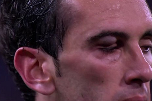 Los reclamos de los jugadores del Atlético no se hicieron esperar, más aún al ver a su compañero Godín, quien terminó con el ojo morado tras el golpe de Suárez.