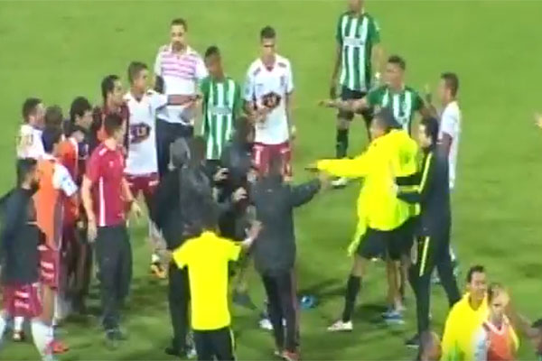 Una vez finalizado el partido los futbolistas del cuadro trasandino se lanzaron contra sus rivales y también del árbitro José Argote.