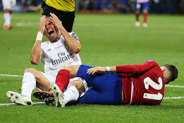 Cuando se disputaba el segundo tiempo extra en Milán, un choque entre el delantero belga del Atlético, Yannick Carrasco, y el defensor portugués Pepe, del Real Madrid, terminó con una exagerada reacción del luso, quien quedó dando vueltas en el piso, como si hubiera recibido un duro golpe por parte de su rival.