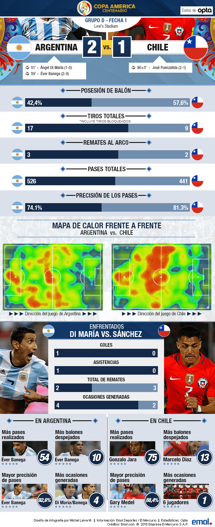 Repase los datos más destacados que dejó el encuentro que terminó con triunfo de 2-1 para la "Albiceleste" en la Copa Centenario.