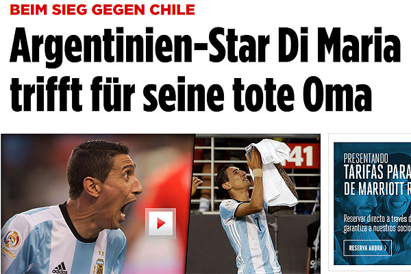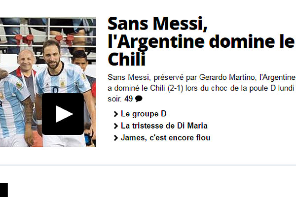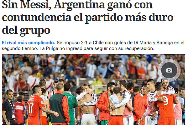 "El actual campeón de América, Chile, dio un golpe tardío con el gol de José Pedro Fuenzalida. Pero también un trío "alemán" no pudo evitar la derrota. Charles Aránguiz del Leverkusen tuvo una pérdida catastrófica de la pelota que permitió un gol argentino. Arturo Vidal del Munich se ganó la amarilla y Eduardo Vargas del Hoffenheim cayó a duras penas".