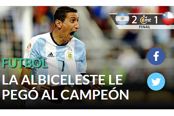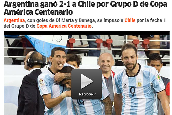 "La "Albiceleste" le pegó al campeón. De la mano de Ángel di María, la Selección de Argentina retomó su hegemonía en Sudamérica al derrotar 2-1 a Chile, campeón defensor de la Copa América. Si Chile nunca ha podido derrotar al equipo pampero en el torneo que se disputa en Sudamérica, ahora la estadística ya se extendió a Estados Unidos con una destacada actuación del Fideo Di María".