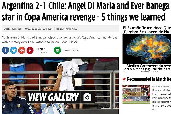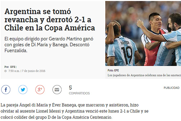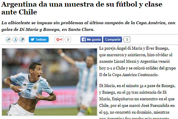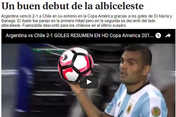 "Argentina se tomó revancha y derrotó 2-1 a Chile en la Copa América. Di María y Banega finiquitaron un encuentro en el que Chile no concretó su dominio, mientras que Argentina fue mucho más punzante. El empuje de Arturo Vidal no fue suficiente, como tampoco lo fue la entrega de Alexis Sánchez, que se fajó sin éxito con la zaga argentina".
