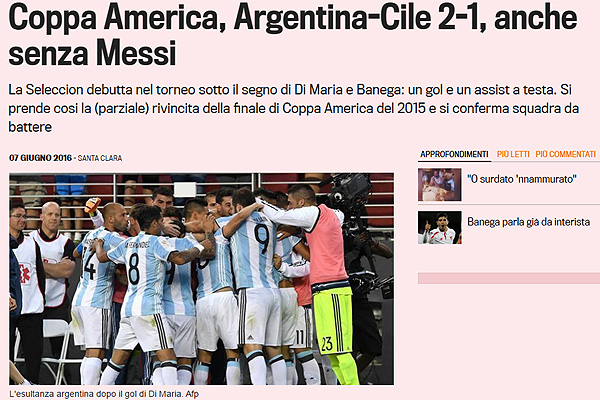 "Un año después de la final de la Copa América 2015 que se decidió en los penales en favor de Chile, Argentina tomó una venganza brillante. Misión cumplida para Gerardo Martino, que optó por dejar a Lionel Messi en el banco por riesgo a la lesión que sufre".