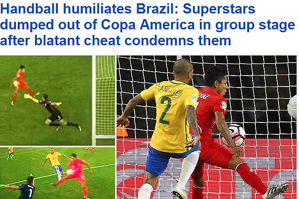 "Brasil eliminado en handball. Raul Ruidiaz dio el golpe de knock-out que envió a Brasil a estrellarse fuera de la Copa América . Literalmente, la estrella Perú golpeó la pelota con la mano en el fondo de la red para sellar una eliminación humillante para la Seleção".
