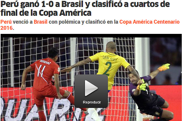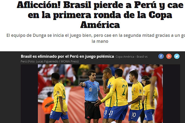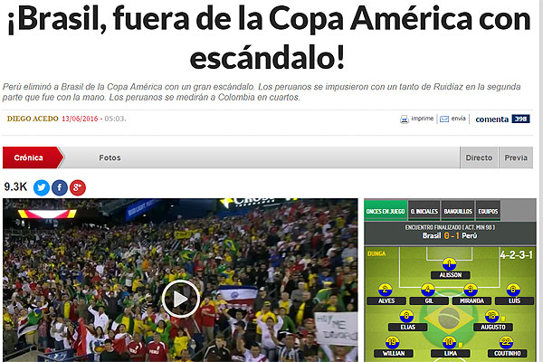 "Perú eliminó a Brasil de la Copa América con un gran escándalo. Los brasileños se despiden a las primeras de cambio de la Copa América. Podrán decir que fue injusta su eliminación por ese tanto tan polémico. Pero en la primera jornada contra Ecuador les favorecieron con un gol de los ecuatorianos que no subió al marcador. Su papel en esta Copa y su prematura eliminación deberían abrir un proceso de cambio en la pentacampeona del mundo".