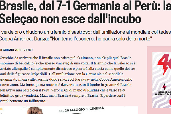 "La lista de fracasos de la selección brasileña crece con cada torneo. La vergüenza de ahora es la eliminación en la primera ronda de la Copa América Centenario que llegó tras caer 1-0 contra Perú en Boston, con un error de arbitraje, que validó el gol con la mano de la selección peruana".