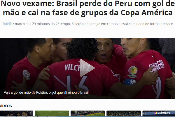 "Nuevo fracaso: Brasil pierde Perú con mano meta y cae en la fase de grupos de la Copa América. ¿Perjudicados por el gol ilegal? Sí. Pero mucho más daño causó la gestión confusa dentro y fuera de la cancha. Este es el nivel del fútbol brasileño actual. Un equipo con talento, pero sin convicciones".