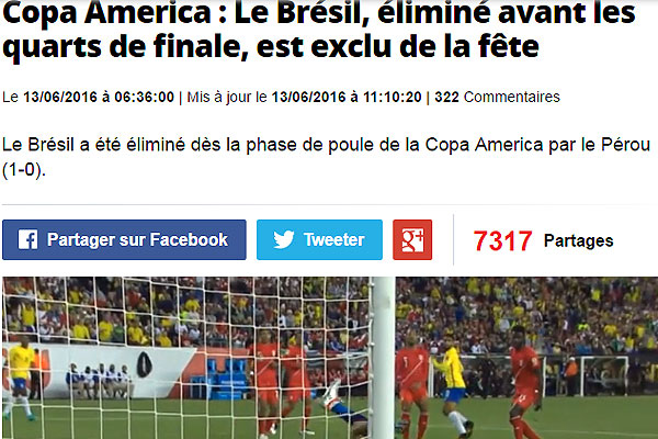 "La Copa América celebrará su centenario este año y Brasil no es ni siquiera invitado a la fiesta. Los brasileños salen de la competición en la fase de grupos por segunda vez después de 1987. Fueron eliminados por Perú. Eliminación que ha dado mucho que hablar ya que es el resultado de un gol con la mano de Raúl Ruidiaz. Este revés podría sellar el destino de Dunga".
