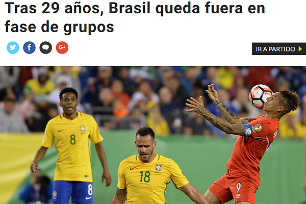 "Brasil hizo el ridículo en la Copa Centenario luego de quedar eliminado en la Fase de Grupos tras perder con Perú 0-1 con una polémica mano del delantero Ruidíaz y que tuvo la complicidad de los árbitros. Sin embargo, lo más sobresaliente es que el equipo comandado por Dunga quedó fuera de una fase de grupos del torneo continental por primera vez en 29 años".