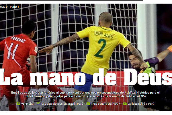 "La mano de Deus. Brasil se va de la Copa América al caer con Perú por una acción escandalosa de Ruidíaz. Histórico para el fútbol peruano y duro golpe para el Scratch. ¿Te acordás de la mano de Tulio en el '95?. Despedida para Dunga y compañía. Un Dunga que entra en el ojo de la tormenta por esta eliminación, más allá de cómo se definió. Continuidad para unos. Adeus para otros...".
