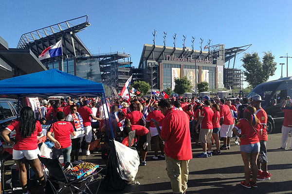 Dos horas antes del inicio del partido entre Chile y Panamá, en el estacionamiento del estadio Lincoln Financial Field se vivió un verdadero ambiente de carnaval entre los hinchas de la "Roja" y los panameños.