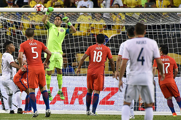 Es Claudio Bravo, quien en el primer tiempo contra Colombia se ha lucido con ya cuatro intervenciones clave que han impedido el descuento de los cafeteros.