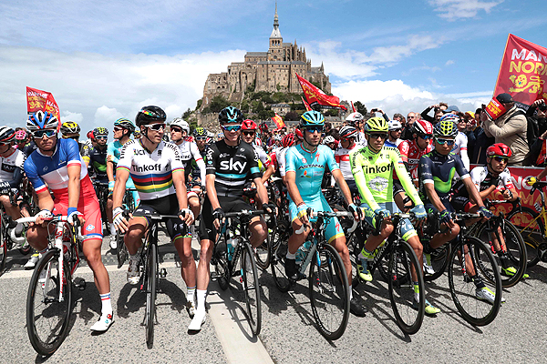 Vichot, Sagan, Froome, Nibali, Contador y Quintana en una de las largadas de etapa del Tour.