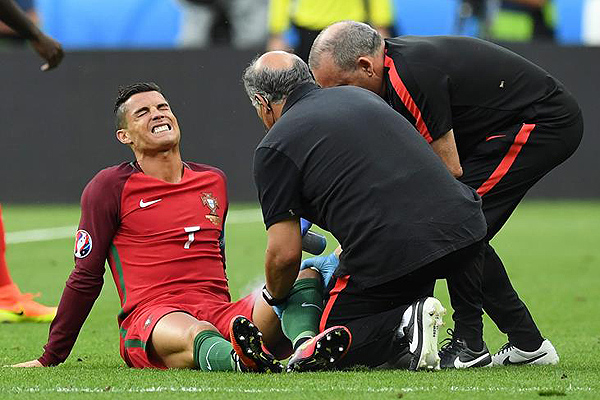El atacante de Portugal Cristiano Ronaldo se lesionó en la final de la Eurocopa ante Francia.